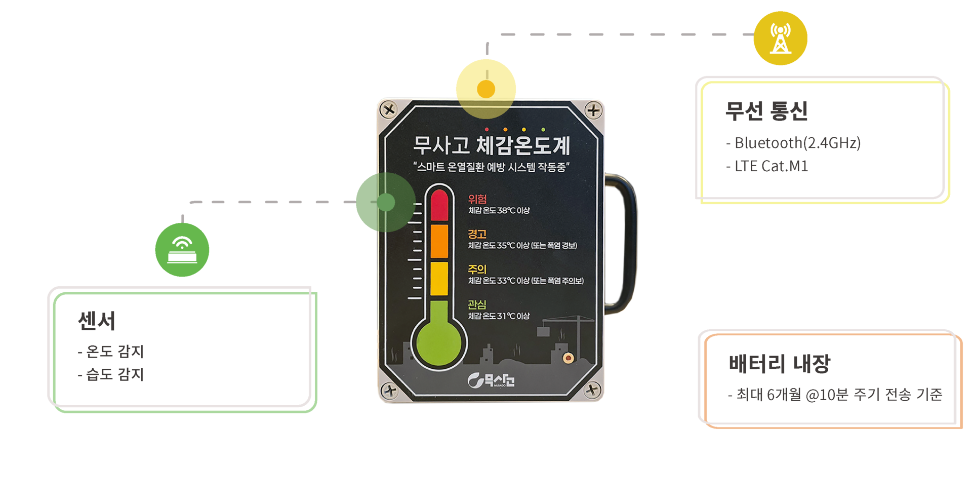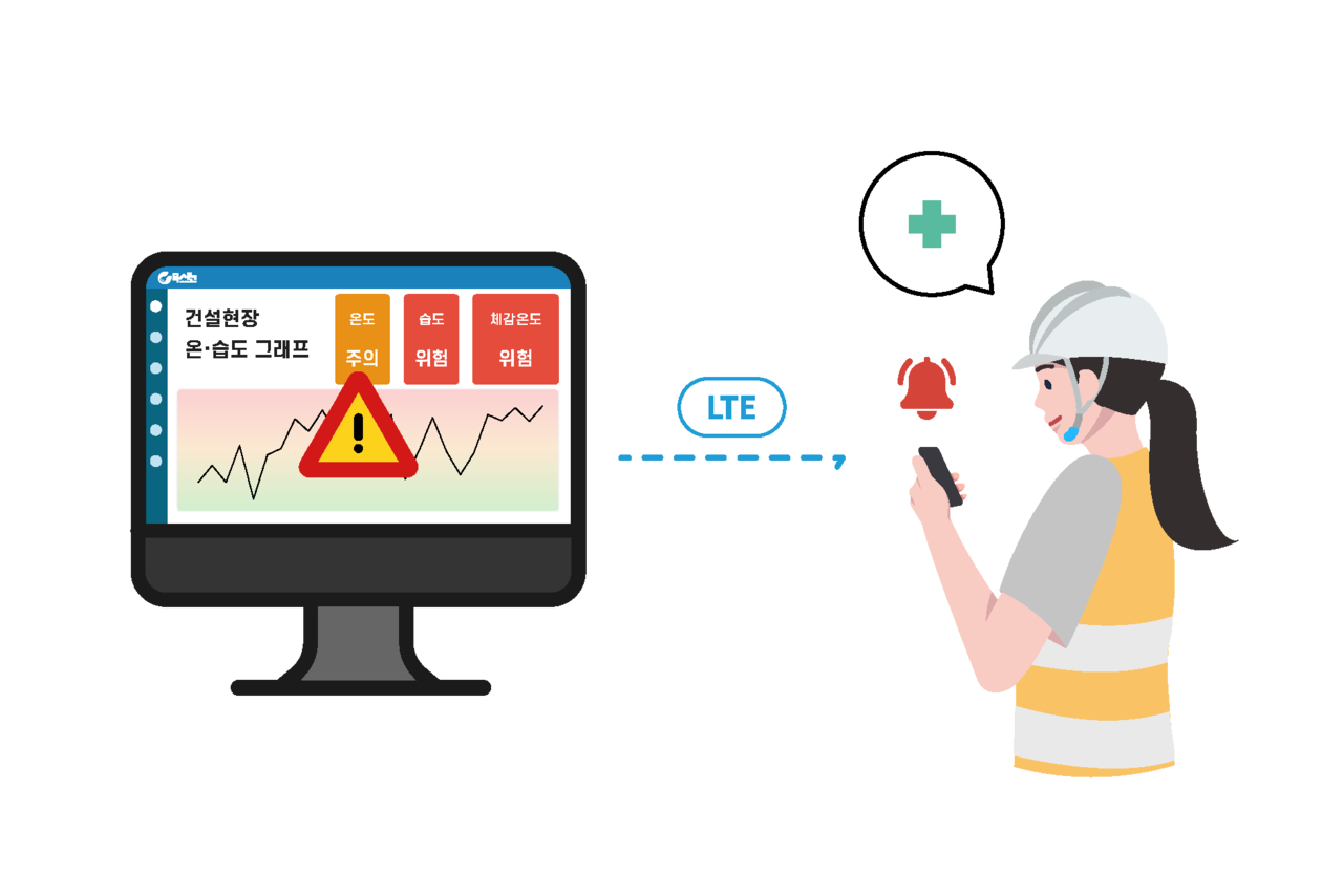 위험 온도 감지 시 관리자에게 알림을 주어 온열질환을 예방할 수 있도록 돕는 스마트안전장비입니다.