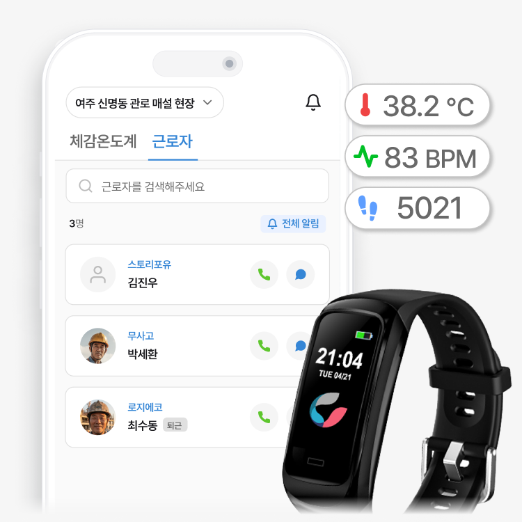 무사고 밴드는 체온·심박수·걸음수를 기록하고 실시간 전송합니다. 건강 이상이 감지되면 관리자에게 즉시 알림과 함께 위치 정보를 전송해 신속한 대응을 돕습니다. 산업 현장 온열 질환 고위험군 근로자 관리에 적합합니다.
