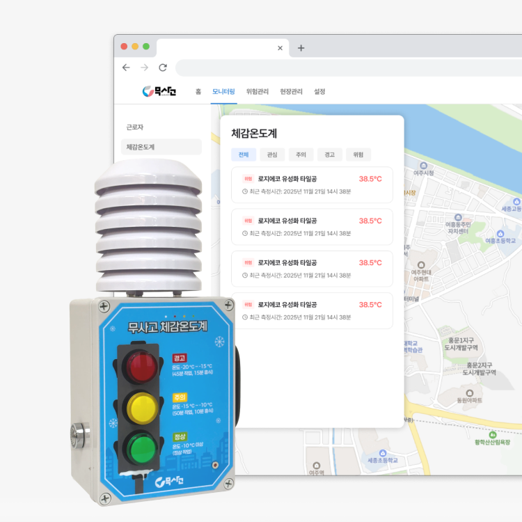 무사고 체감온도계는 IP65 방수·방진 설계와 배터리를 내장해 산업 현장에 손쉽게 설치할 수 있습니다. 체감온도를 실시간으로 서버에 LTE 통신하여 언제 어디서든 열 위험 수준을